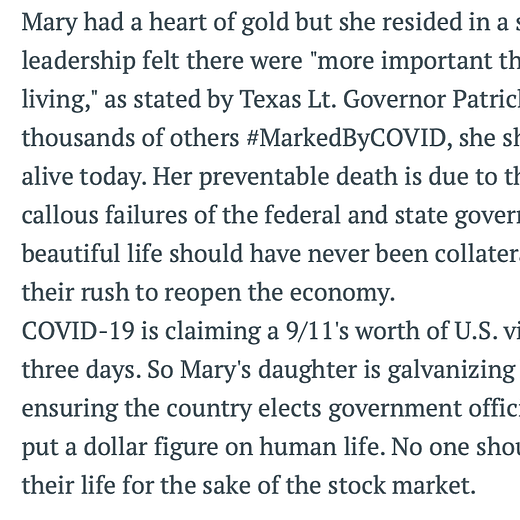 I started FacesOfCOVID in March of 2020 as the pandemic began its first surge as a means of uplifting the basic dignity of the people we were losing by telling the stories behind the statistics and putting a name and face to our losses. I also felt from the earliest days that many of these deaths were preventable if our government had made better decisions, and if we as members of community had been more committed to each other’s wellbeing, so I also see this effort as fundamentally about accountability.