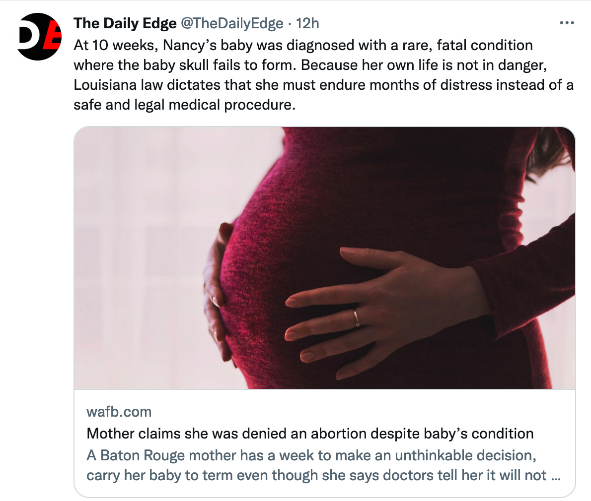 Davis says her baby was diagnosed with acrania. A rare and fatal condition, where the baby’s skull fails to form in the womb. According to health experts, babies with this condition only survive minutes to hours after birth. But because Davis’s life was not in danger and the baby’s condition does not fall under Louisiana Department of Health’s list of qualifying conditions, she was denied an abortion. Unsure about what to do, Davis is faced with a tough decision. Either carry the baby to term, or cross state lines to get an abortion.